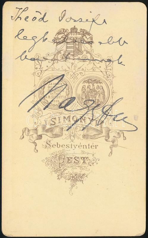 Beschreibung: Nagy Imre (1849-1893) színművész, rendező, a Színiakadémia tanára Keöd József színésznek dedikált dedikált fotója. 1870 körül. 7x10 cm