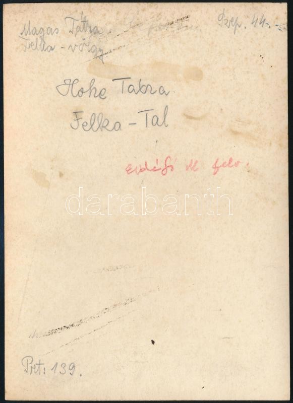 cca 1910 Magas-Tátra, Felka-völgy, Erdélyi Mór felvétele, hátulján feliratozva, 11,5×16 cm / cca 1910 Vysoké Tatry, Velická dolina, with notes on its back, 11,5×16 cm
