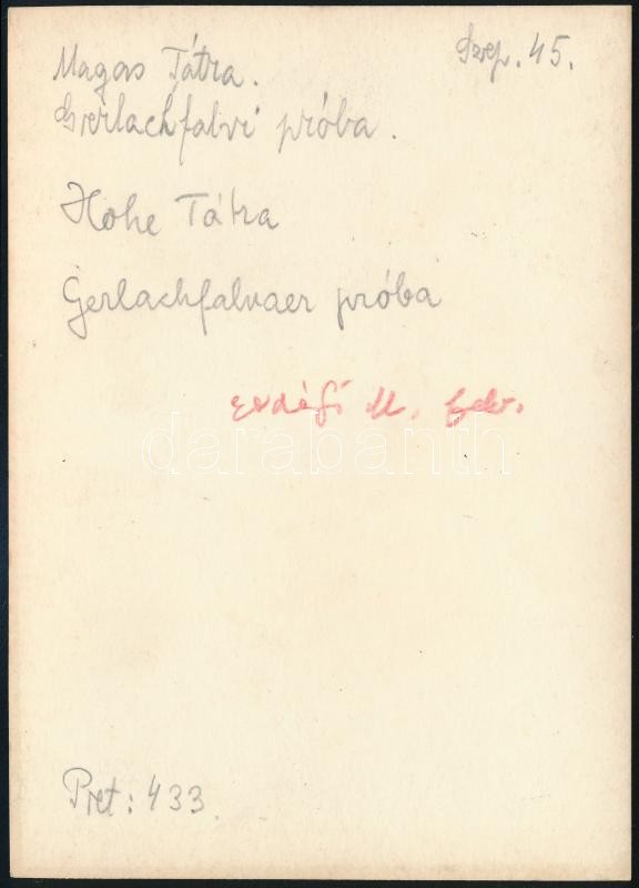 cca 1910 Magas-Tátra, Gerlachfalvi próba, Erdélyi Mór felvétele, hátulján feliratozva, 11,5×16 cm / cca 1910 Vysoké Tatry, Velická/Gerlachovská próba, with notes on its back, 11,5×16 cm