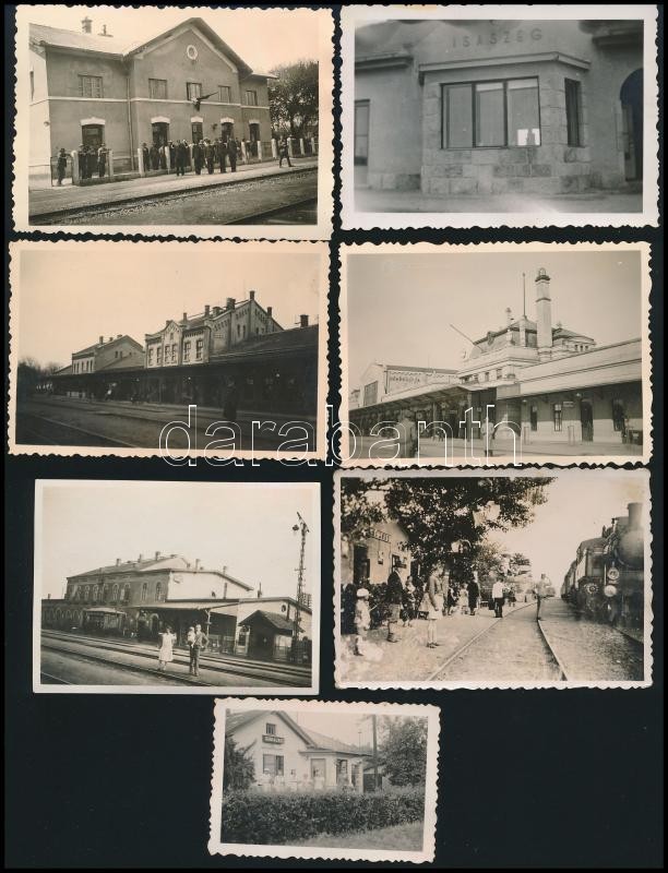 Beschreibung: cca 1930-1940 Régi magyar vasútállomások (Isaszeg, Nógrád, Dunaalmás, Szerencs, stb.) , 7 db fotó, hátuljukon feliratozva, 6×9 cm