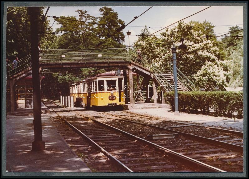 Beschreibung: cca 1960 Budapest, a kisföldalatti az azóta megszűnt felszíni szakaszon, színes fotó, kartonra ragasztva, 9,5×13,5 cm