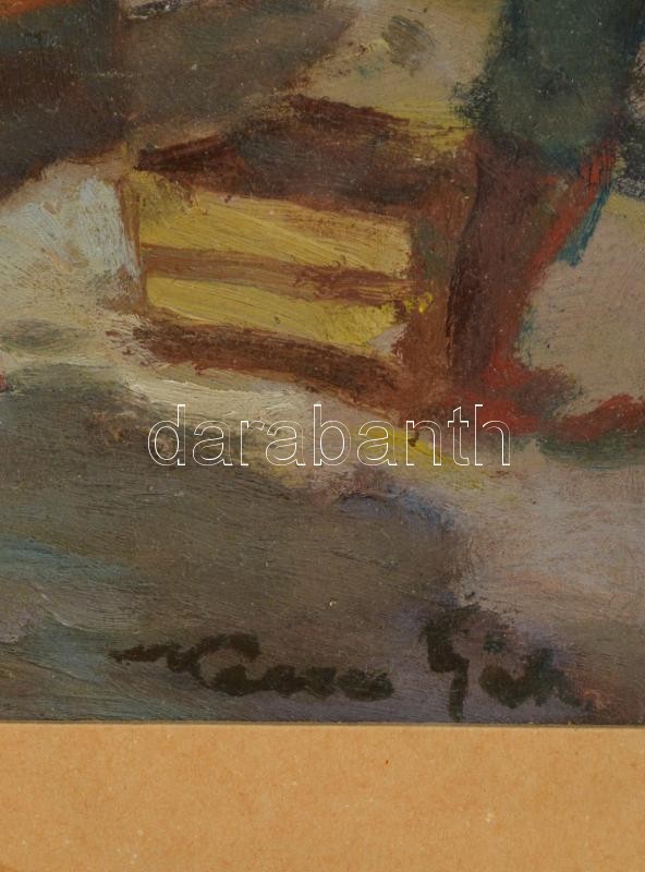 Beschreibung: Kássa Gábor (1893-1961): Zuglói piac részlet. Olaj, karton, jelzett, üvegezett keretben, 28×38 cm