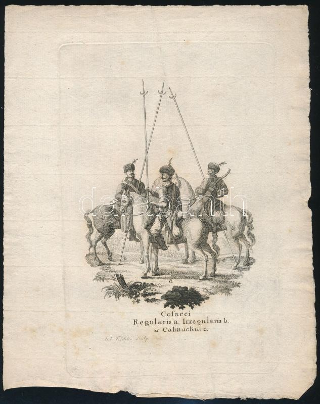 1789 A kozák katonák- Cosacci regularis a. irregularis b & Calmuckus c. Ant Tischler rézmetszete. Megjelent: Grondski, Samuel de Grondi: Historia Belli Cosacco-Polonic. Pest, 1789. 13x18 cm / Kosak and Kalmuk soldiers. Etching.