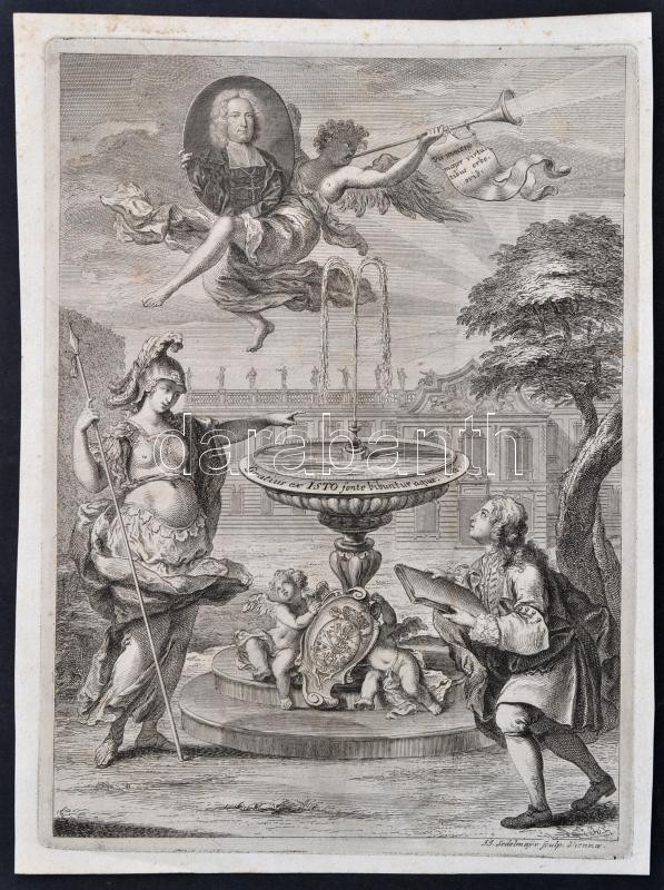 Jeremias Jakob Sedelmayr (1706-1761): Gratius ex ipso fonte bibuntur aquae (Ovidius), allegorikus illusztráció, rézkarc, papír, hajtásnyommal, 28x20 cm.