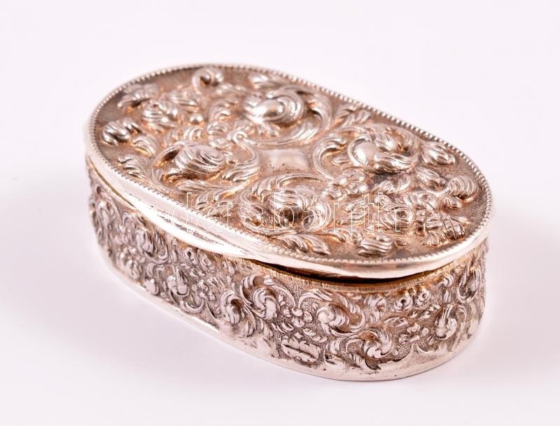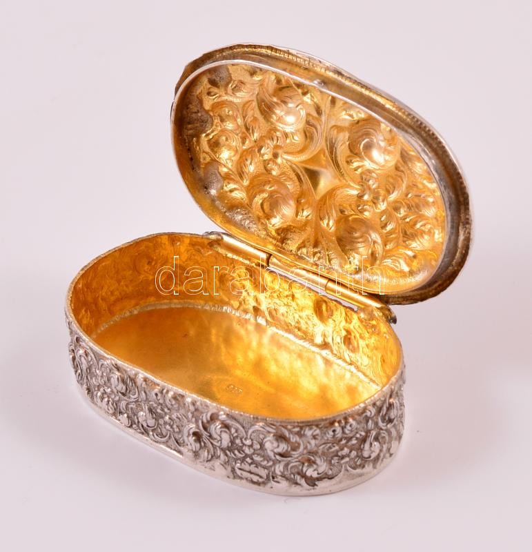 Ezüst (Ag.) gyógyszeres dobozka, belül aranyozott, jelzett, 4×2,5 cm, ... https://www.darabanth.com/de/342-Fernauktion/342.0/Juwelen/Juwelen~500032/Ezust-Ag-gyogyszeres-dobozka-belul-aranyozott-jelzett-4C3972-5-cm-netto20-g~II1926125