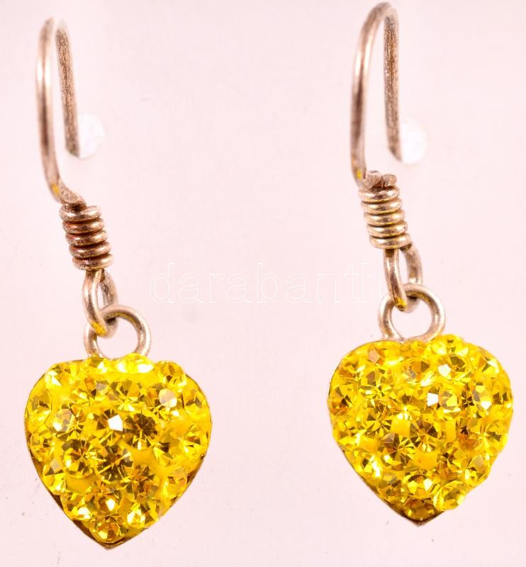 Beschreibung: Ezüst(Ag) szívecskés sárga strasszokkal kirakott fülbevalópár, jelzett, bruttó: 1,1 g
