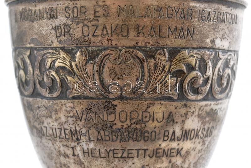 cca 1930 A Kőbányai Sör és Malátagyár igazgatóságának Dr. Czakó Kálmán vándordíja az üzemi labdarúgó bajnokság I. helyezettjének. Ezüst kupa 34 cm, 266 g