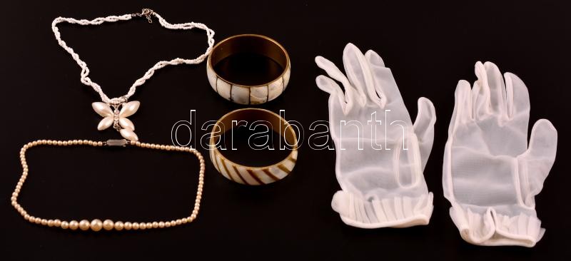 Beschreibung: 2 db kagylóberakásos karperec + 1 db tekla nyaklánc + 1 db gyöngy nyaklánc + 1 pár fehér kesztyű