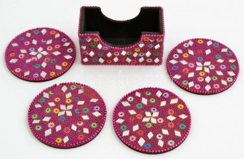 Beschreibung: 4 db dekoratív lila poháralátét hozzá illő tartóban, d: 7,5 cm