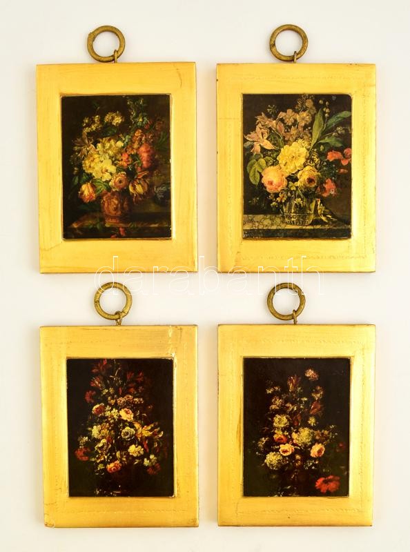 Beschreibung: 4 db virágos nyomat, aranyszínű fa alapon, 19x14,5 cm