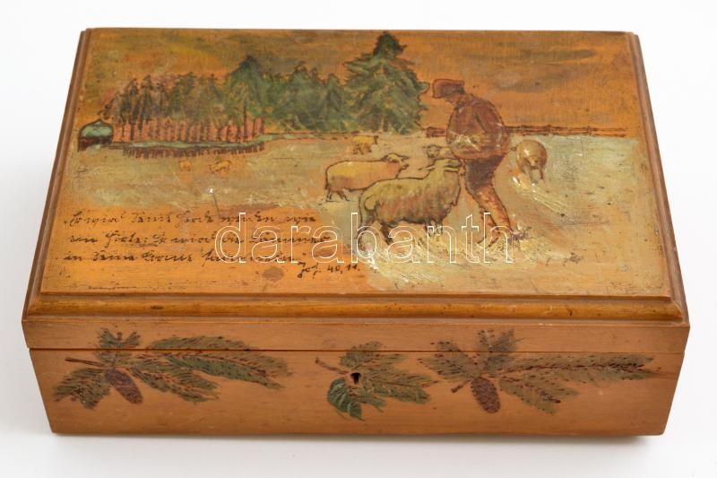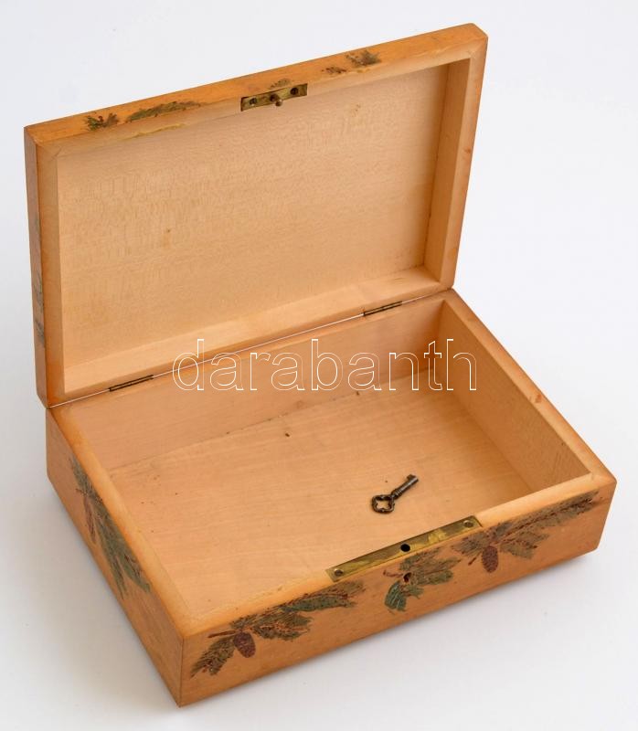 Díszes fa doboz, kulccsal, az egyik lába hiányzik, 23,5×16×8 cm https://www.darabanth.com/de/342-Fernauktion/342.0/Kunst-Dokumente-andere-Sammelgebiete/Flohmarkt~500012/Diszes-fa-doboz-kulccsal-az-egyik-laba-hianyzik-23-5C39716C3978-cm~II1927945
