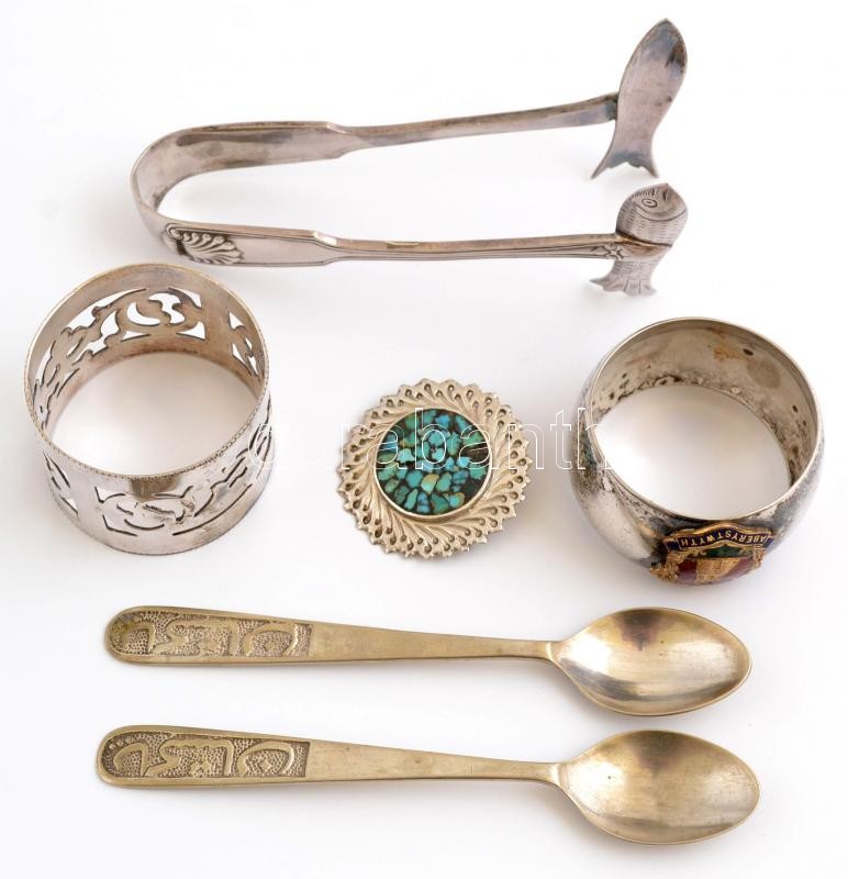 Beschreibung: Ezüstözött használati eszközök (cukorcsipesz, szalvétagyűrű, kiskanál, stb.), 6 db
