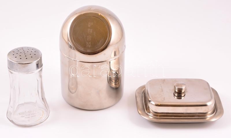 Beschreibung: Fém tárgyak (3 db): vajtartó, mini szemetes, cukorszóró, m:13-19 cm, 15×12 cm