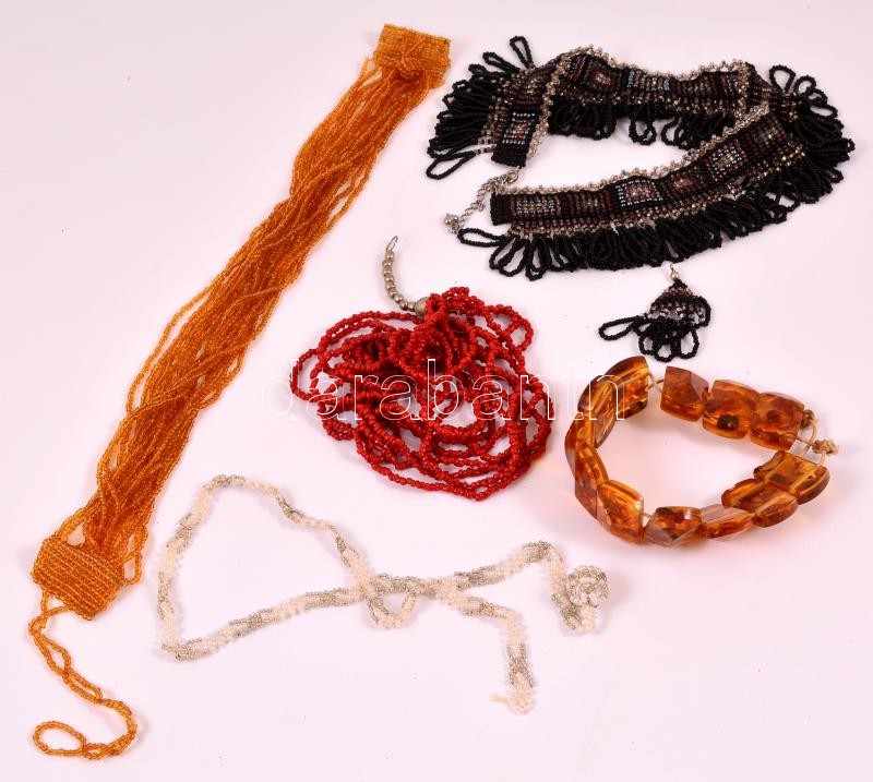 Beschreibung: Gyöngy nyakláncok, 4 db + borostyán karkötő, gumicserére szorul