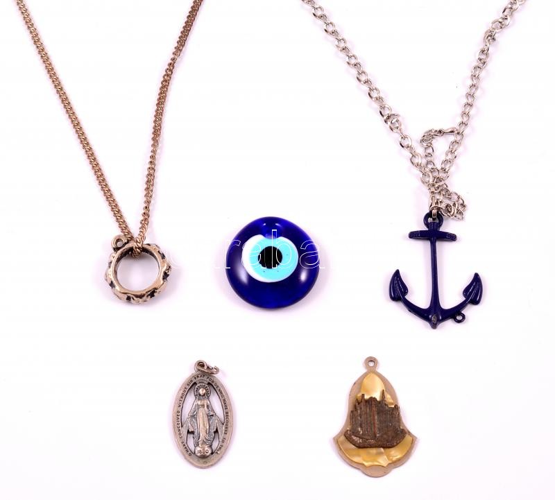 Beschreibung: Kis ékszer tétel, 2 db nyaklánc, üveg medál, Szűz Mária medál, stb., 5 db