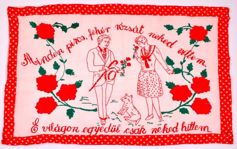 "Minden piros, fehér rózsát neked vittem..." feliratú hímzet... https://www.darabanth.com/de/342-Fernauktion/342.0/Kunst-Dokumente-andere-Sammelgebiete/Flohmarkt~500012/Minden-piros-feher-rozsat-neked-vittem-feliratu-himzett-konyhai-falvedo-73C39748-cm~II1910526