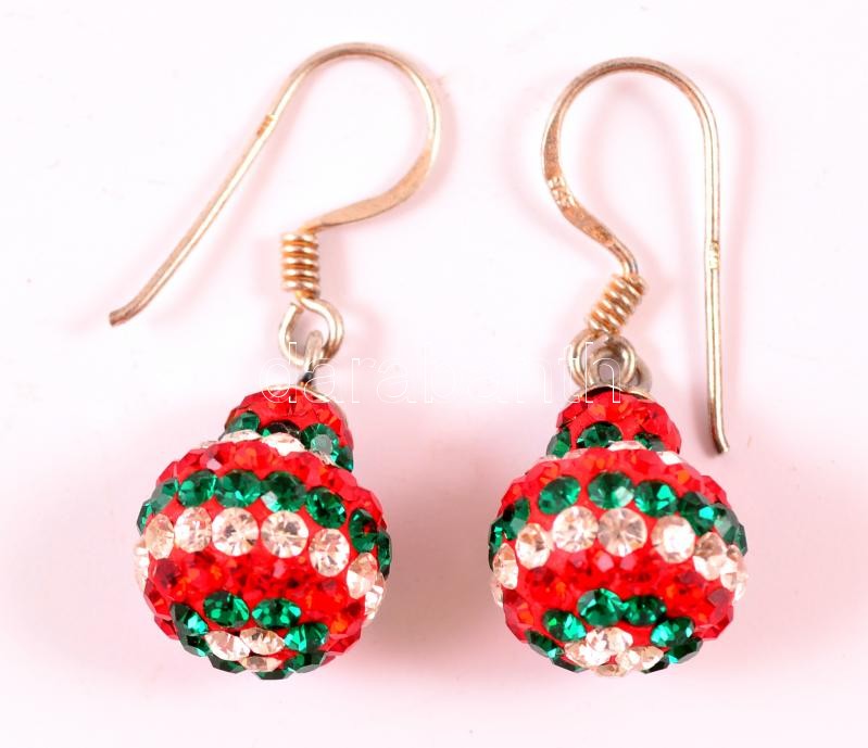 Beschreibung: Prios-fehér-zöld strasszokkal díszített gömb alakú fülbevalópár ezüst(Ag) szerelékkel, jelzett