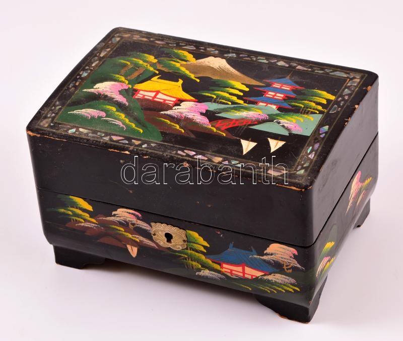 Beschreibung: Távol-keleti fa zenélődoboz, benne forgó figurával, működik, 18×12×10 cm