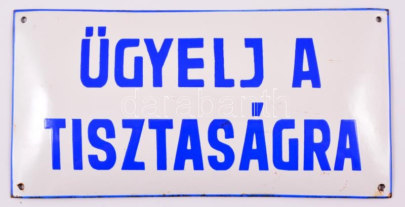 "Ügyelj a tisztaságra" zománcozott fém tábla, 15×30 cm https://www.darabanth.com/de/342-Fernauktion/342.0/Kunst-Dokumente-andere-Sammelgebiete/Flohmarkt~500012/Ugyelj-a-tisztasagra-zomancozott-fem-tabla-15C39730-cm~II1931874