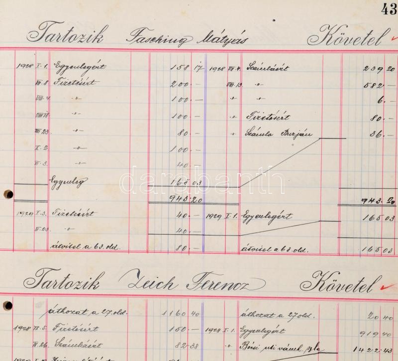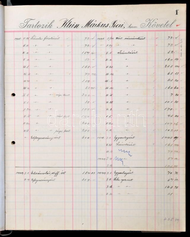1928-1929 Adósságkönyv, benne magánszemélyekkel, és cégekkel. Közte Soproniakkal (pl.: Klein Márkus és fiai, Székely és Társa, Rákóczi István, Füredi-Cavallár, Trogmayer Ödön, Lenk Téglagyár, Sopron város..stb.), és más ismeretekkel is. (Singer Varrógép Rt.) A végén 1957.-es lakás-leválasztás jegyzékével.