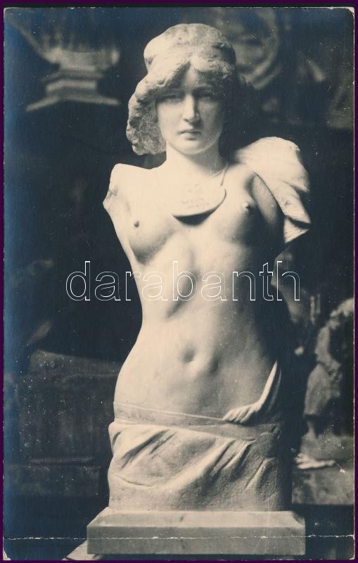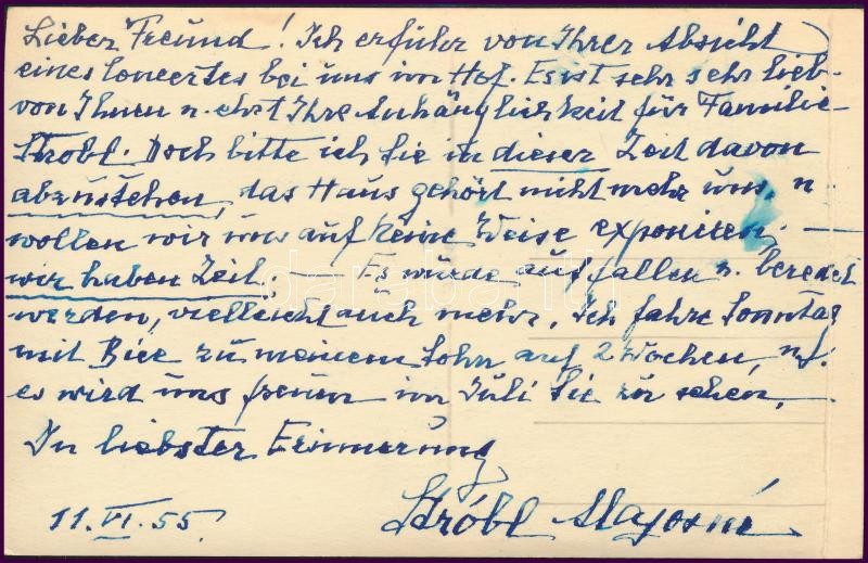 1955 kisfaludi Strobl Alajosné, Kratochwill Alojzia Lujza (1876-1964) saját kézzel írt levelezőlapja Keltscha Nándor hegedűművészhez, Stróbl munkáját ábrázoló fotón