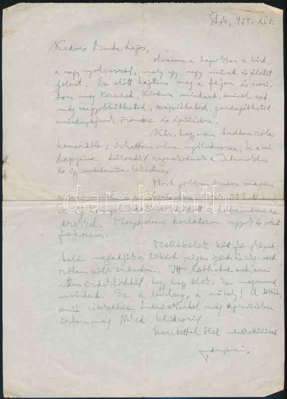Beschreibung: 1958 Stósz/Štós Fábri Zoltán (1897-1970) írótól saját kézzel írt levele, aláírásával Barta Lajos (1878-1964) írónak.