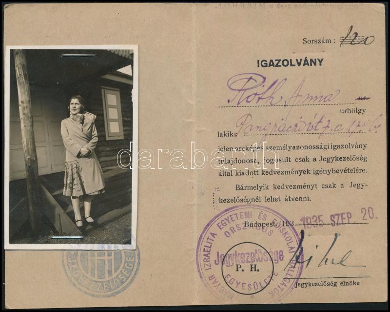 1935 a Magyar Izraelita Egyetemi és Főiskolai Hallgatók Egyesülete fé... https://www.darabanth.com/de/342-Fernauktion/342.0/Kunst-Dokumente-andere-Sammelgebiete/Judaica~500025/1935-a-Magyar-Izraelita-Egyetemi-es-Foiskolai-Hallgatok-Egyesulete-fenykepes-tagsagi-igazolv~II1927784