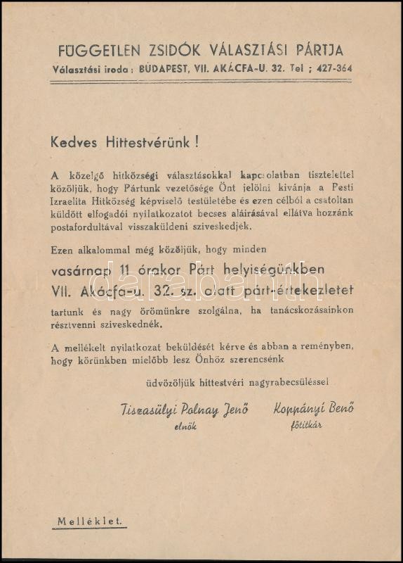 Beschreibung: cca 1948 a Független Zsidók Választási Pártja meghívója, ill. elfogadói nyilatkozata
