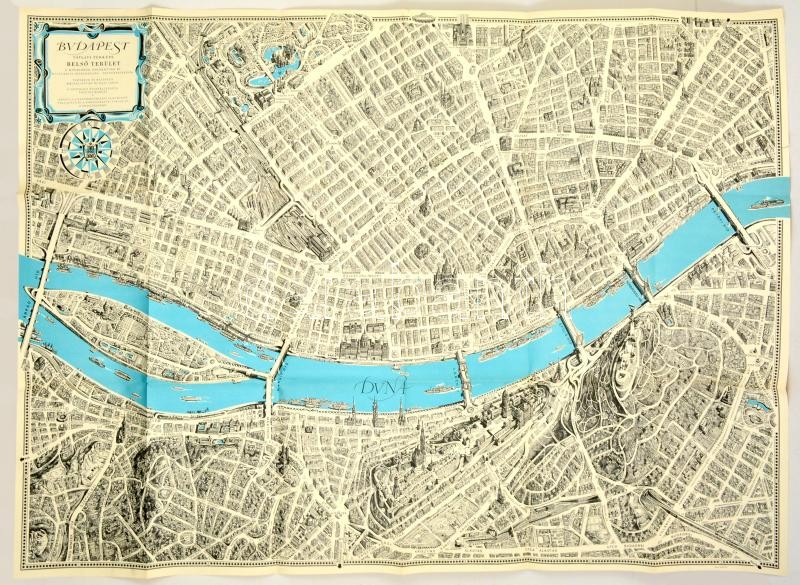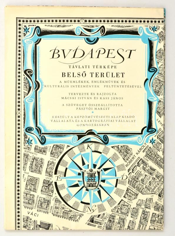 1963 Budapest távlati térképe, belső terület. A műemlékek, emlékművek és kulturális intézmények feltüntetésével. Tervezte Mácsai István-Kass János, Képzőművészeti Alap Kiadóvállalata - Kartográfiai vállalat, 117×82 cm.