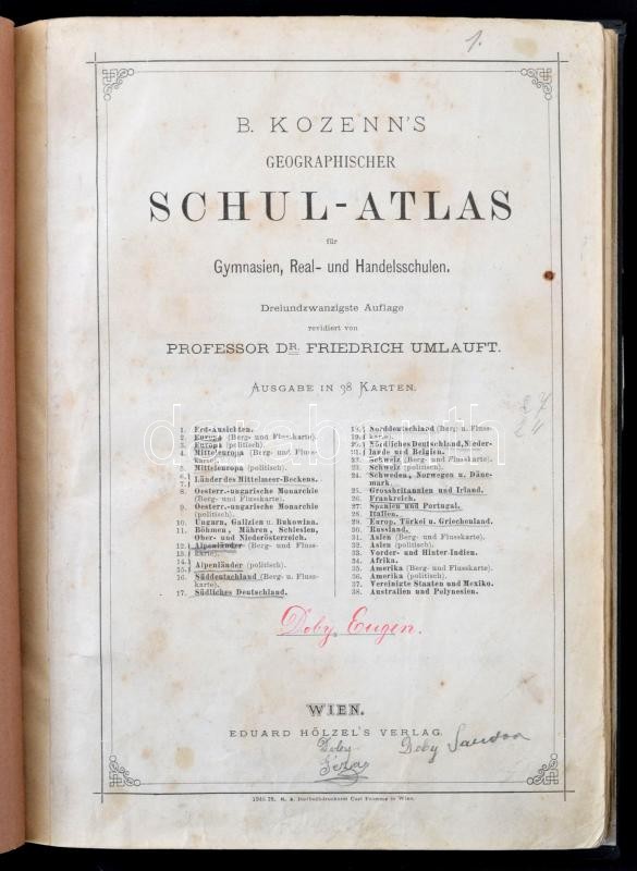 B[lasius] Kozenn: Geographischer Schul-atlas für Gymnasien, Real- und Handelsschulen. Wien,é.n., Eduard Hölzel's Verlag, 10 p.+38 t. 23. kiadás. Átkötött félvászon-kötés, javított kötéssel, kis szakadásokkal a lapokon. Doby Jenő (1834-1907) grafikus, és fia Doby Géza (1877-1968) biokémikus névbejegyzéseivel.