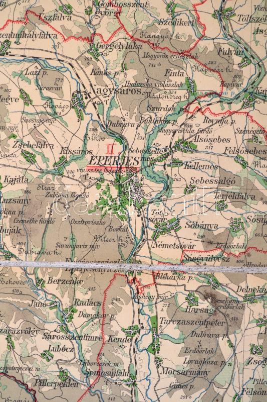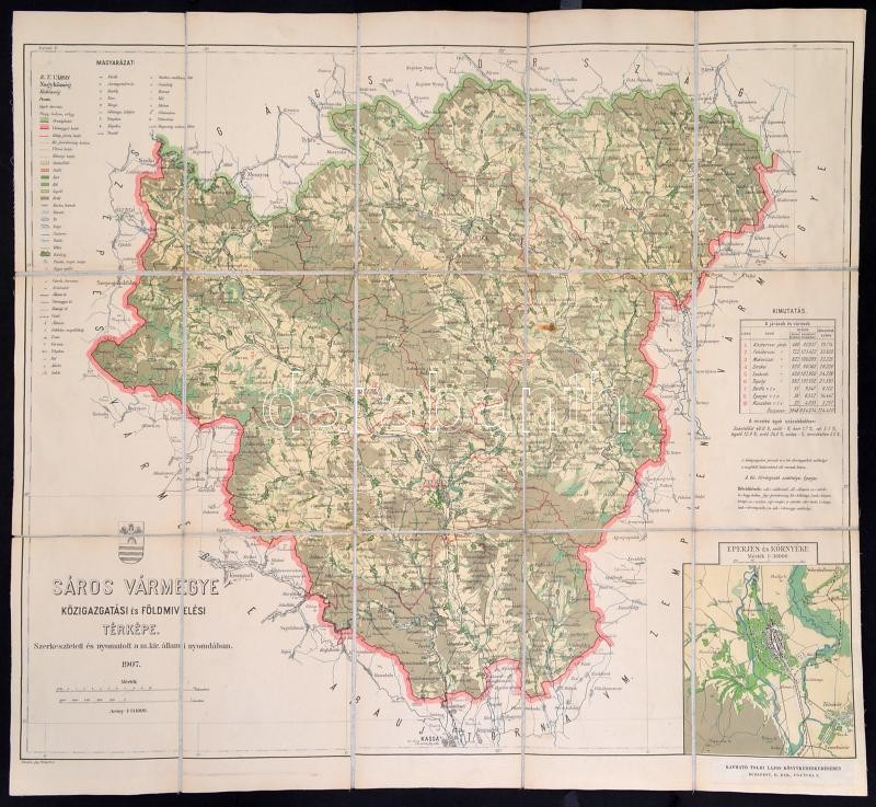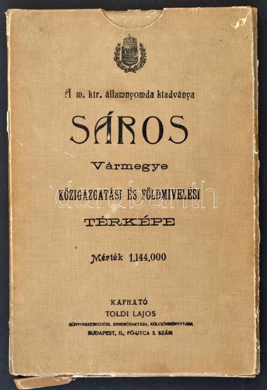 Sáros vármegye közigazgatási és földmívelési térképe. Szerkesztetett és nyomatott a m. kir. államnyomdában. Mérték: 1 : 144 000. Budapest, 1907. M. Kir. Államnyomda. A lap mérete: 73 x 67 cm. Színes, lith. térképlap, hajtogatva, vászonra kasírozva, eredeti, feliratos, kissé sérült védőtokjában. Megkímélt, jó állapotú példány. / Map of Saros county