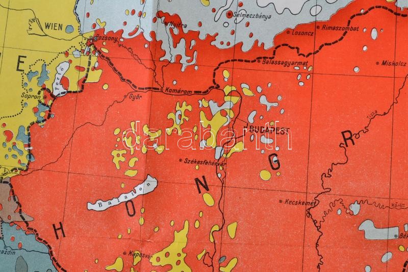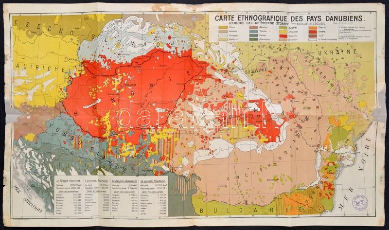 cca 1928 Carte Ethnografique Des Pays Danubiens. A dunai országok néprajzi térképe. Összeállította: Dr. Györffy István. 1:2.000,000. Bp., M. Kir. Állami Térképészet, francia nyelven, a széleken hiánnyal, javított, intézményi bélyegzővel. 37x63 cm. Ritka!