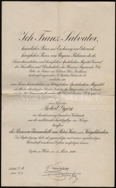 / Hungary 1915. Awarding warrant of the "Red-Cross Bronze Medal with military ornament" decoration with facsimile sign of Duke Franz Salvator 21x34 cm)