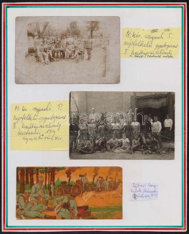 Beschreibung: 1917 A szegedi 5 népfelkelő gyalogezred II. hadtápzászlóaljának katonái. 2 db érdekes eredeti fotó és egy számolócédula tablón.