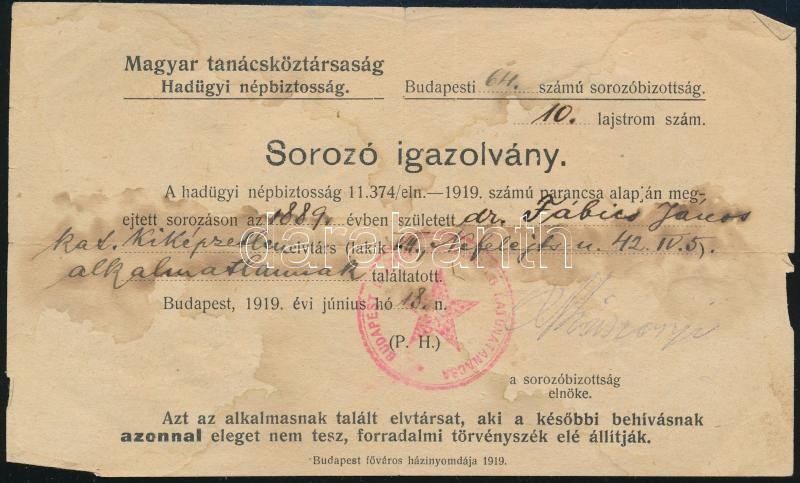 1919 Bp., tanácsköztársasági sorozó igazolvány katonai szolgálatra alk... https://www.darabanth.com/de/342-Fernauktion/342.0/Kunst-Dokumente-andere-Sammelgebiete/Militaria~500028/1919-Bp-tanacskoztarsasagi-sorozo-igazolvany-katonai-szolgalatra-alkalmatlannak-talalt-sze~II1924958