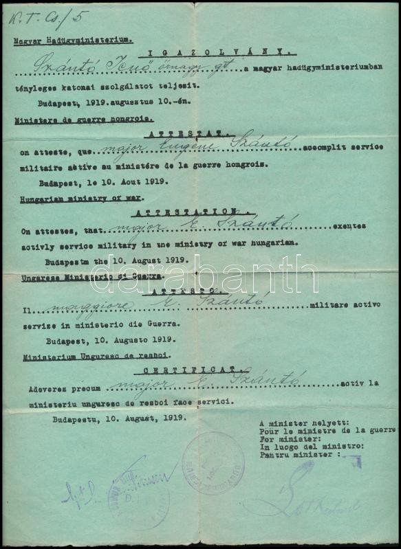 1919 Hadügyminisztériumi öt nyelvű szolgálati igazolás (aug. 10.) Szán... https://www.darabanth.com/de/342-Fernauktion/342.0/Kunst-Dokumente-andere-Sammelgebiete/Militaria~500028/1919-Hadugyminiszteriumi-ot-nyelvu-szolgalati-igazolas-aug-10-Szanto-Jeno-ornagy-resz~II1929345