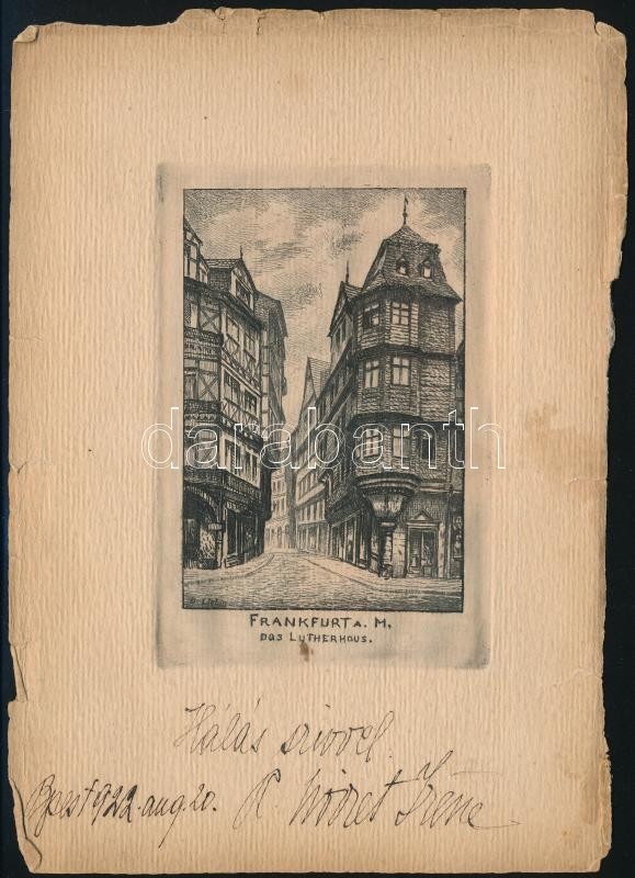 1922 Irene de Noiret (1896-1984) magyar származású német kabaré és chanson énekesnő saját kezű sorai, és aláírása egy Frankfurt a. M. utcarészletet ábrázoló rézkarcon.