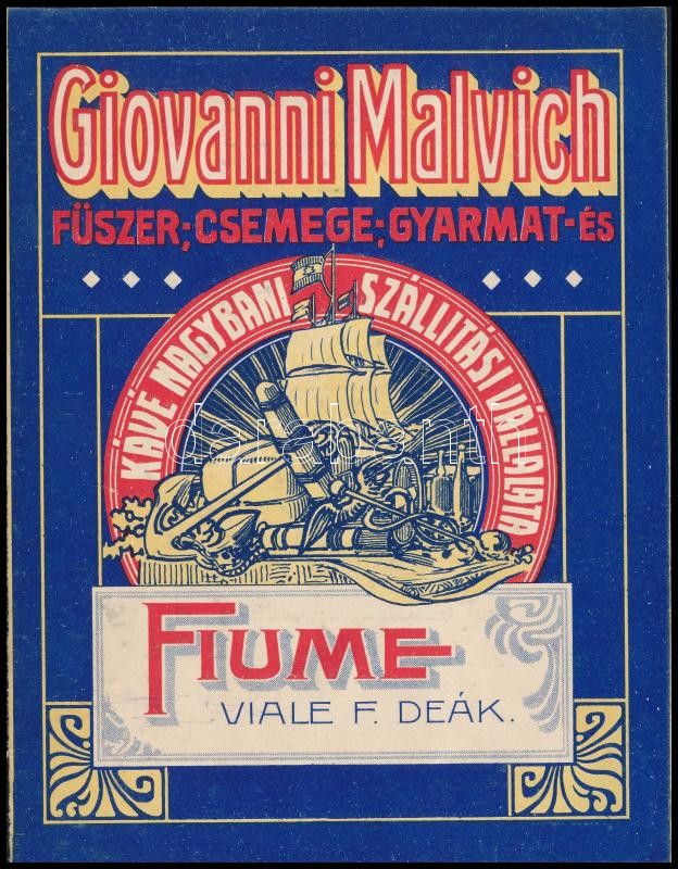Giovanni Malvich Fűszer-, Csemege-, Gyarmat- és Kávé Nagybani Szállítá... https://www.darabanth.com/de/342-Fernauktion/342.0/Kunst-Dokumente-andere-Sammelgebiete/Werbungen~500022/Giovanni-Malvich-Fuszer-Csemege-Gyarmat-es-Kave-Nagybani-Szallitasi-Vallalata-Fiume-ci~II1925772