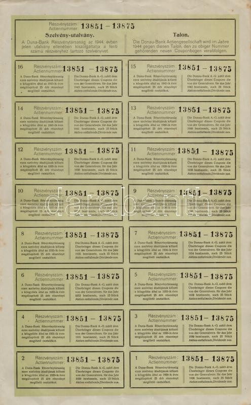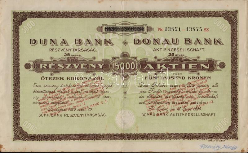 Budapest 1920. "Duna Bank Részvénytársaság" részvénye 5000K-... https://www.darabanth.com/de/342-Fernauktion/342.0/Numismatik/Aktien-und-Tickets~1500005/Budapest-1920-Duna-Bank-Reszvenytarsasag-reszvenye-5000K-rol-szelvenyekkel-es-szarazpe~II1928108
