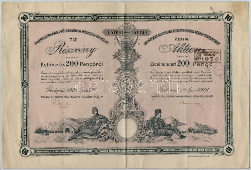 Budapest 1926. "Magyar Általános Kőszénbánya Részvénytársulat" tíz darab részvénye egyenként 200P-ről, két nyelvű, szárazpecséttel és bélyegzéssel T:III
