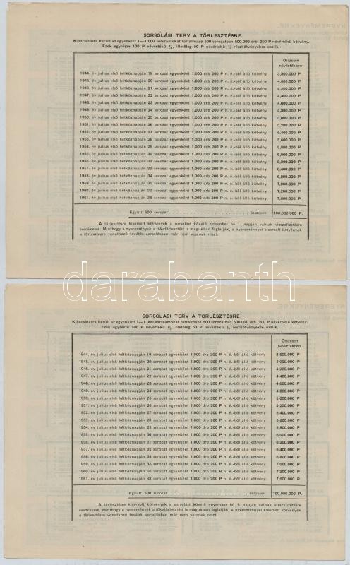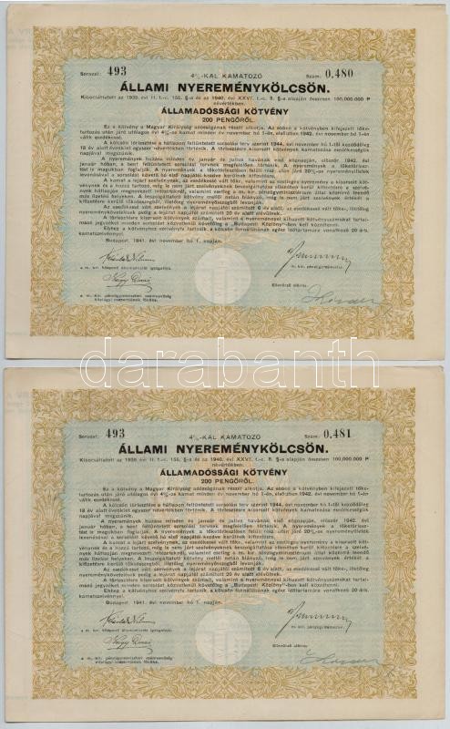 Beschreibung: Budapest 1941. "4%-kal kamatozó állami nyereménykölcsön - államadóssági kötvény" 200P-ről (2x) szárazpecséttel, szelvényekkel, sorszámkövetők T:II,III egyiken szakadás