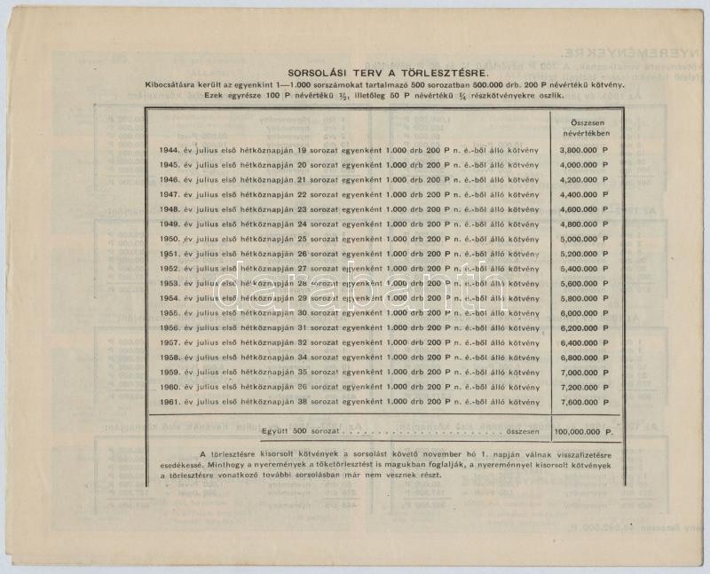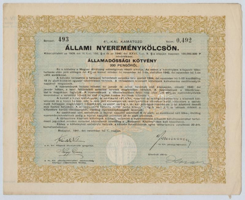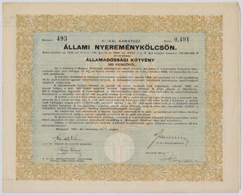 Beschreibung: Budapest 1941. "4%-kal kamatozó állami nyereménykölcsön - államadóssági kötvény" 200P-ről (2x) szárazpecséttel, szelvényekkel, sorszámkövetők T:II,III egyiken szakadás