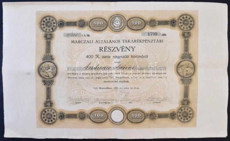 Beschreibung: Marcali 1920. "Marczali Általános Takarékpénztár" névre szóló részvény 400K-ról, szelvényekkel, szárazpecséttel T:III
