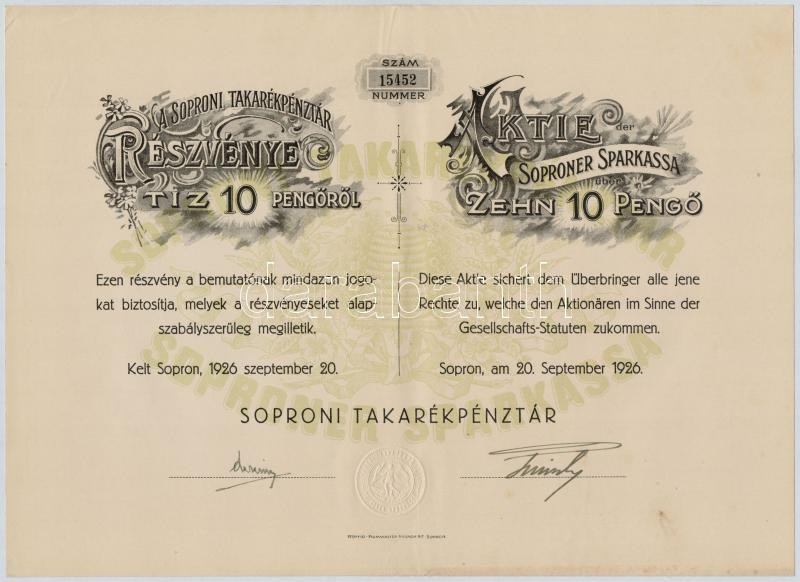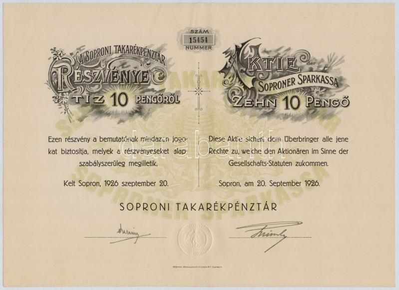 Sopron 1926. "Soproni Takarékpénztár" részvénye 10P-ről, mag... https://www.darabanth.com/de/342-Fernauktion/342.0/Numismatik/Aktien-und-Tickets~1500005/Sopron-1926-Soproni-Takarekpenztar-reszvenye-10P-rol-magyar-es-nemet-nyelvu-szarazpec~II1903819