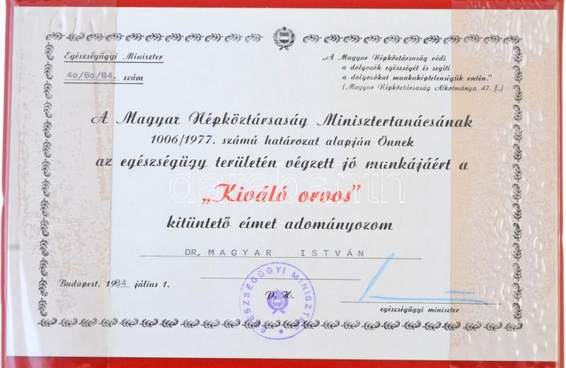 1984. "Kiváló Orvos" zománcozott jelvény eredeti tokban + 2d... https://www.darabanth.com/de/342-Fernauktion/342.0/Numismatik/Faleristik-Auszeichnungen-Medaillen-Orden~1500017/1984-Kivalo-Orvos-zomancozott-jelveny-eredeti-tokban-plus-2db-adomanyozoi-okirat-7E25mm-T1-~II1925743