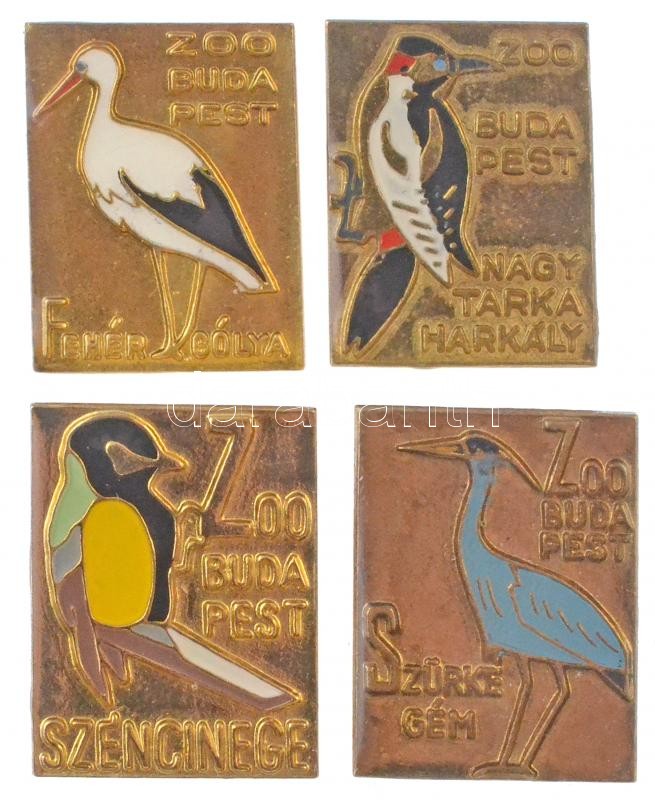 Beschreibung: 4db klf zománcozott, aranyozott "Zoo Budapest" jelvény; Szürke gém, Nagy tarka harkály, Széncinege és Fehér gólya (15x20mm) T:1-,2 egyikről hiányzik a rögzítő