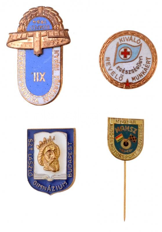 4db-os vegyes jelvény és kitűző tétel, benne "Magyar Autó- és Motorsport Szövetség", "Kiváló Egészségügyi Nevelő Munkáért", "Nyári Főiskolai Bajnokság" és "Szt. László Gimnázium Budapest" T:2,2- egyikről hiányzó tű