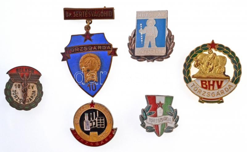 6db-os törzsgárda jelvény tétel, benne: "Bp. Sertésvágóhíd Törzsg... https://www.darabanth.com/de/342-Fernauktion/342.0/Numismatik/Faleristik-Auszeichnungen-Medaillen-Orden~1500017/6db-os-torzsgarda-jelveny-tetel-benne-Bp-Sertesvagohid-Torzsgarda-10-zomancozott-j~II1924809