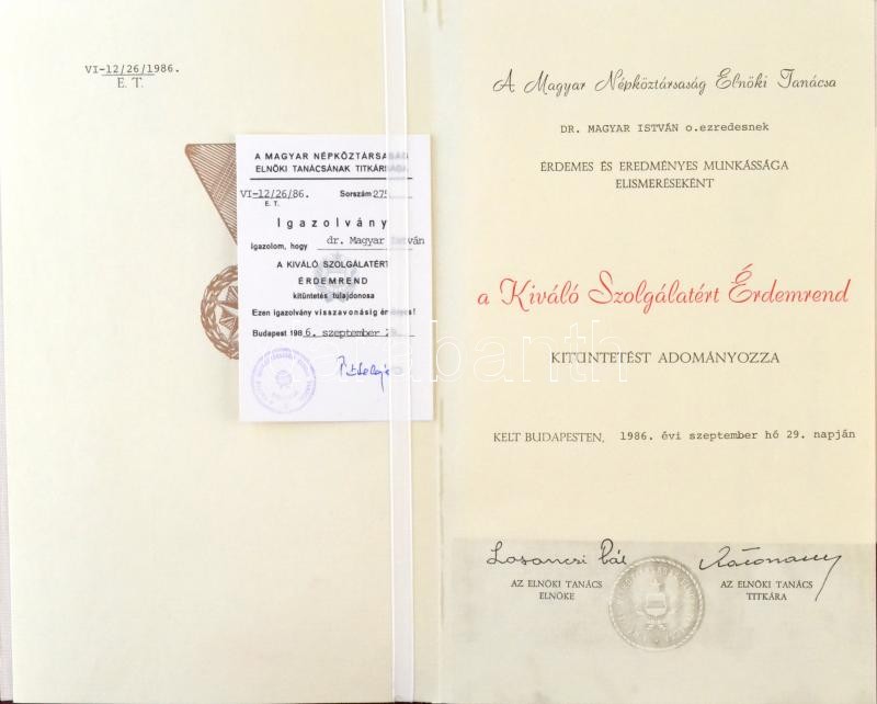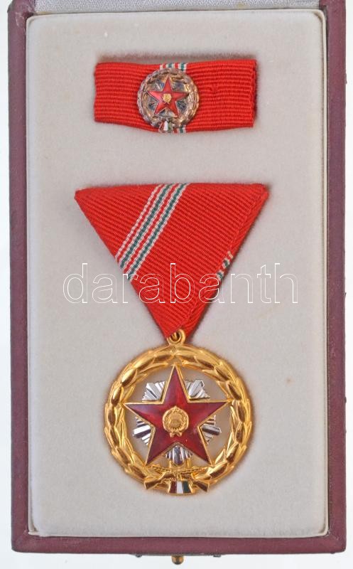 Beschreibung: 1964. "Kiváló Szolgálatért Érdemrend" aranyozott, zománcozott Br kitüntetés mellszalagon, miniatűrrel és szalagsávval, dísztokban + adományozói okirat T:1-