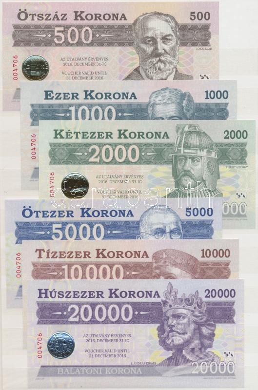 Beschreibung: 2012. 500K "Balatoni Korona" helyi pénz, "004706" sorszámmal + 2012. 1000K "Balatoni Korona" helyi pénz, "004706" sorszámmal + 2012. 2000K "Balatoni Korona" helyi pénz, "004706" sorszámmal + 2012. 5000K "Balatoni Korona" helyi pénz, "004706" sorszámmal + 2012. 10.000K "Balatoni Korona" helyi pénz, "004706" sorszámmal + 2012. 20.000K "Balatoni Korona", helyi pénz "004706" sorszámmal T:I